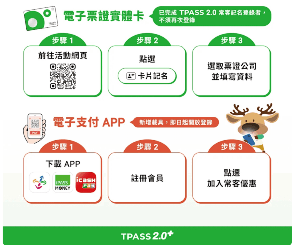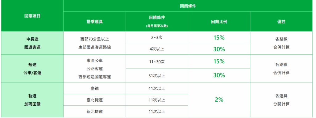 台鉄、台北MRT(環状線含む)、新北MRT(淡海軽軌・安坑軽軌のみ)を対象に、既存の常客優待に加えて政府が2%を追加還元。ただし月11回以上の利用が条件。